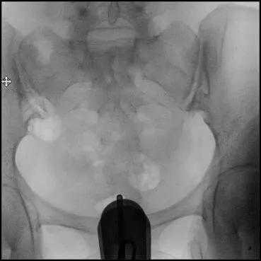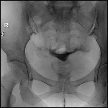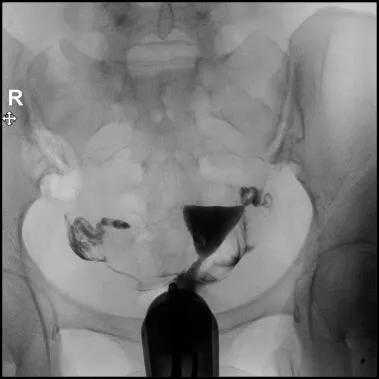 8.透视下注对比剂,动态观察造影剂逐渐膨胀宫腔,流入输卵管,经过伞端流入盆腔的全过程,同时拍摄X光片;